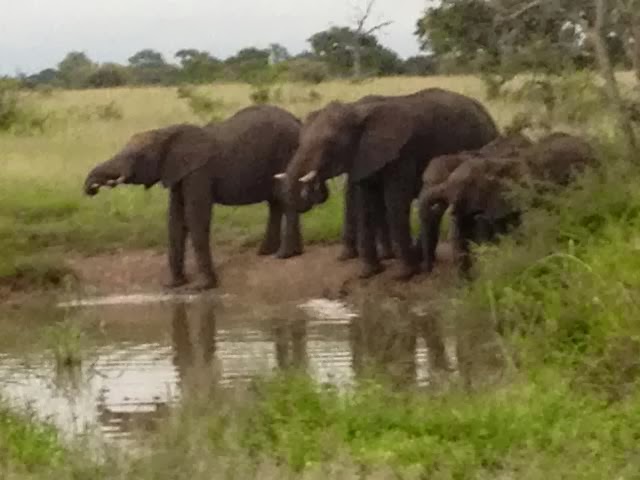 Vol goede moed wandelt het gezelschap – zonder het aanvankelijk in de gaten te hebben – een groep olifanten met diverse koeien en jonge olifantjes tegemoet. De dieren zijn op weg naar een drinkplaats iets verderop. Een fraai maar enigszins ongepland tafereel. De olifanten komen nu van verschillende plaatsen naar de waterplas en de situatie voelt toch even iets anders dan vanuit de auto. Erwin stelt voor om het tafereel toch maar vanuit de jeep te bekijken. Iets verderop lijkt de kust weer veilig en stapt de groep woudlopers weer dapper uit. Het savannegras op de uitstapplaats staat bijna een meter hoog. Even later blijkt op nog geen 50 meter afstand een moeder neushoorn met haar kalfje te grazen. Enigszins opgeschrikt draait moeder zich om. Haar moederinstinct dat biologisch wordt meegebakken zodra ze haar jong werpt, werkt feilloos. Ze zal bij gevaar tot het uiterste gaan om haar kalf te beschermen. Neushoorns zijn erg bijziend, haar kolossale neus is als een kompas in de oriëntatie op de omgeving. Ze bespeurt geen onraad en graast rustig verder. De woudlopers halen opgelucht adem.