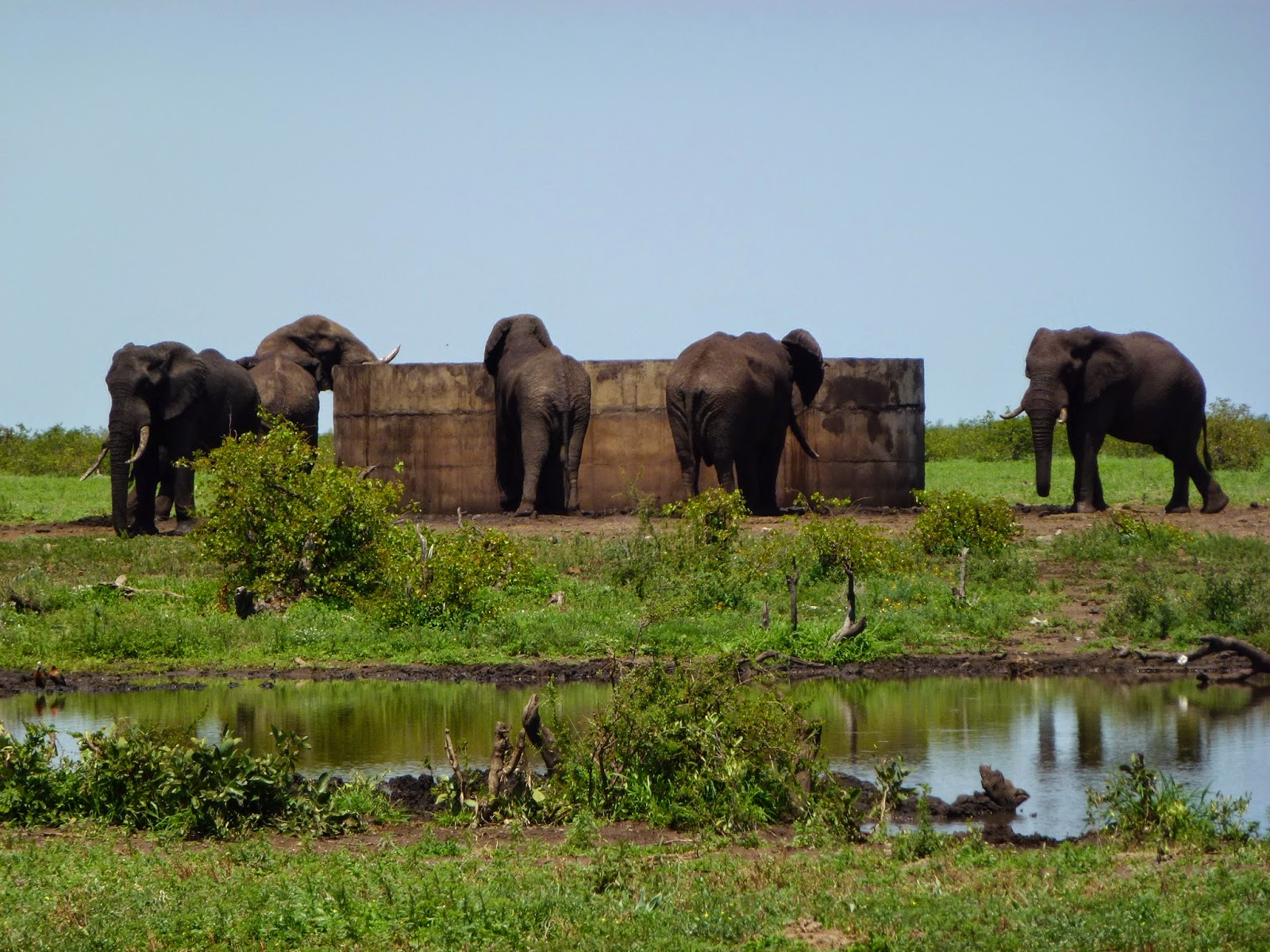 Het park werd toentertijd, net als nu, ook regelmatig getroffen door periodes van droogte. Om te voorkomen dat er teveel dieren het slachtoffer zouden worden van die droogte, werden her en der waterputten geslagen. Grote ronde betonbekkens, waarin het grondwater met milieuvriendelijke windmolens opgepompt wordt. Aanvankelijk hadden de bassins een rand van een meter hoog. Maar omdat daar soms zebra’s en andere kleinere hoefdieren in terecht kwamen en verdronken omdat ze er niet meer uit konden komen, werden de randen twee tot drie meter opgehoogd. Nu kunnen alleen nog de ( volwassen ) olifanten uit deze kunstmatige waterbronnen drinken. Wat men zich met de bouw niet realiseerde is dat de olifanten er zo aan gewend raakten dat zij de natuurlijke poelen en waterplassen zijn gaan mijden. Duidelijk is op bijgaande foto te zien dat zij bij voorkeur uit de betonnen badkuip slurpen en ondertussen het natuurlijke kreekje laten voor wat het is. Het gemak dient kennelijk niet alleen de mens. Wat blijkt? Jaren later is de olifantenpopulatie zo onstuimig gegroeid dat het aantal olifanten een serieus probleem vormt voor de vegetatie. Sommige delen van het natuurreservaat rond Punda Maria zijn nu afgezet met schrikdraad om olifanten te weren. Hun enorme eetlust vormt een regelrechte bedreiging voor de groenvariëteit in het landschap.